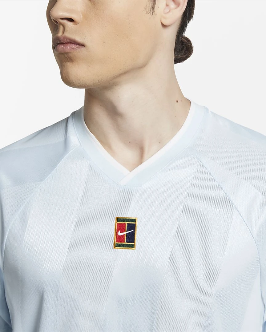 Gear up in Nike Court Breathe Slam Top. This short sleeve top takes on more of a modern style. Inspired from the classic soccer knits, it features a ribbing collar and sleeve cuffs. At the center of the chest is the NikeCourt logo.
